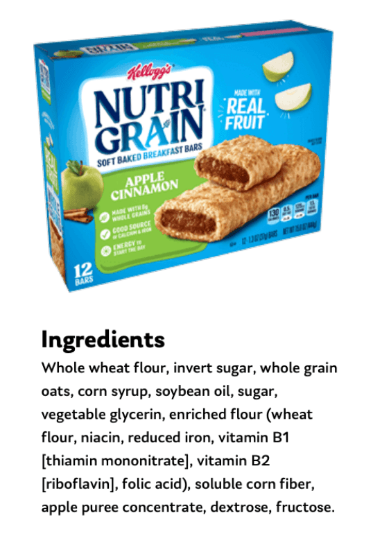Below are the ingredients for Nutrigrain bars, which are marketed as healthy. Notice the top ingredients include three grains (Whole wheat flour, whole grain, enriched flour), SIX types of sugar (inverted sugar, corn syrup, sugar, vegetable glycerin, dextrose, and fructose), and soybean oil (the most popular seed oil).